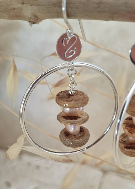 NATURELLE Boucles d'oreilles créoles argent 925, perles de culture d'eau douce et coco naturel